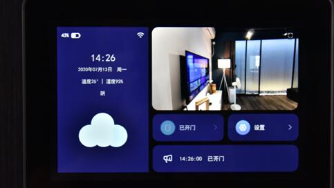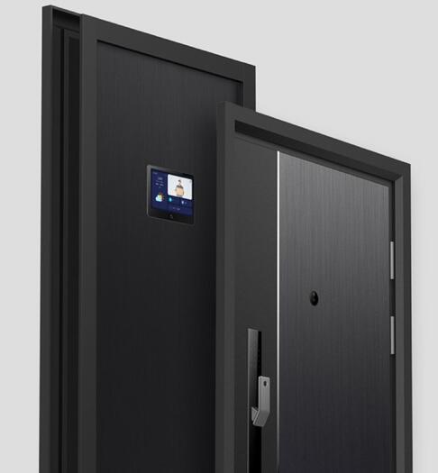 在智慧門門內側部分中間嵌有一款10英寸超大高清液晶屏,同樣采用一體化嵌入設計,與門融為一體。只要人靠近,顯示屏會自動亮起。同時,如果有人按門鈴的話,液晶屏會自動顯示門外情況,還可直接與門外訪客語音對話。